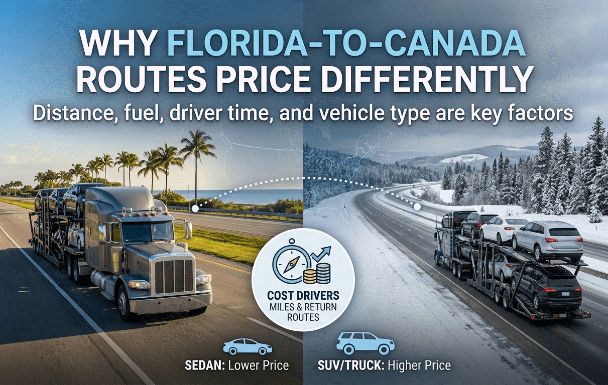 If you’re getting ready to move your car, SUV, or truck from Florida back to Canada—whether as a snowbird heading north after winter or handling a one-time relocation—knowing the shipping cost from Florida to Canada helps you plan without surprises. Typical quotes for open transport range from $1,200 to $2,500 or more, depending on your exact pickup city (Miami, Orlando, or Tampa), the Canadian destination (Toronto, Montreal, or farther west), vehicle size, and timing. These figures cover door-to-door or terminal-to-terminal service on a professional carrier. Enclosed shipping adds 30-50% to the base rate for extra protection.